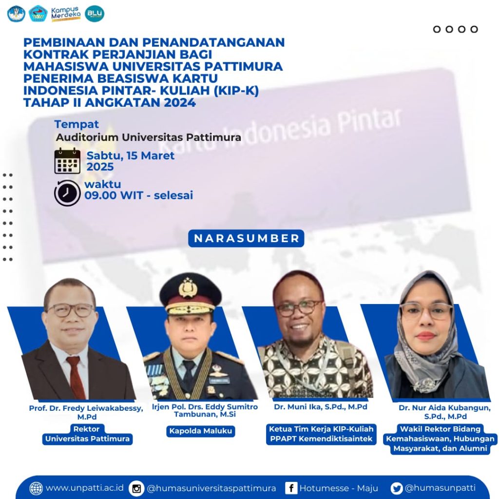 PEMBINAAN DAN PENANDATANGANAN KONTRAK PERJANJIAN BAGI MAHASISWA UNPATTI PENERIMA BEASISWA KIP-K TAHAP II TAHUN 2024 Tanggal: Sabtu, 15 Maret 2025Waktu: 09:00 - Location: Auditorium Universitas Pattimura Facebook Twitter WhatsApp Pinterest